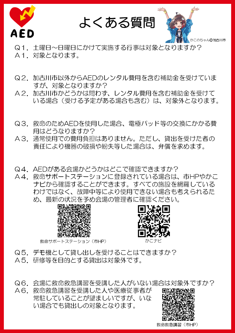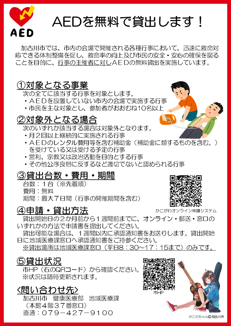 加古川市では、市内の会場で開催される各種行事において、迅速に救命対応できる体制整備を促し、救命率の向上及び市民の安全・安心の確保を図ることを目的に、主催者に対しAEDの無料貸出事業を開始します。
