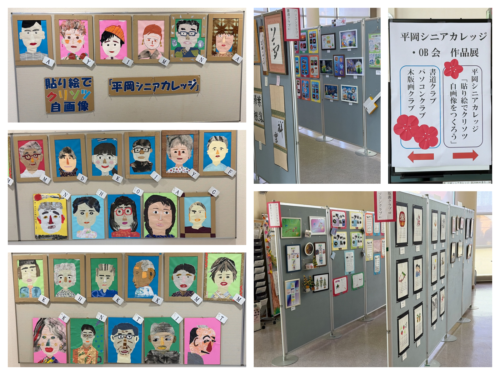 10月10日(金曜日)に開催した平岡シニアカレッジ「ものづくり体験講座」で作成した「貼り絵でクリソツ自画像をつくろう」の作品をはじめ、木版画クラブ・書道クラブ・パソコンクラブの力作が展示されています。