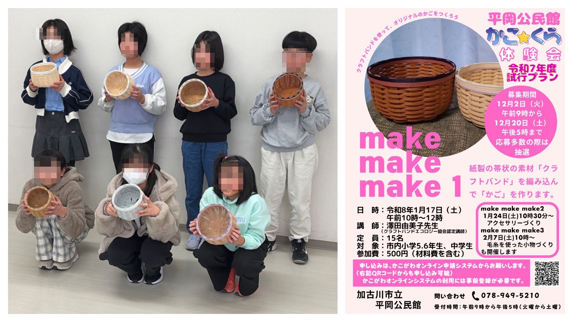 すでに募集は終了していますが、「かこ☆くら体験会」第2・3弾として、リボンやビーズを使って、自分だけのアクセサリー(イヤリング)を作る「make make make 2」を 令和8年1月24日(土曜日)に、推し色の毛糸を編んで、お花のモチーフチャームを作る「make make make 3」を 令和8年2月7日(土曜日)開催します