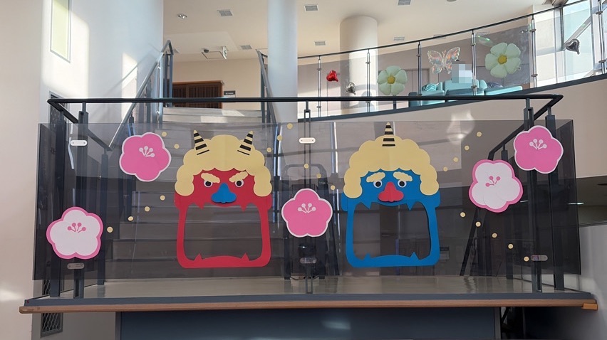 1月の午の干支をあしらった飾り付けも来館者の皆さんに大好評でしたが、今日から、2月3日の節分に向け、鬼を中心とした飾り付けに変更しました。