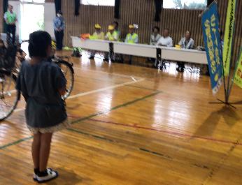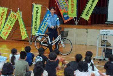 その後、加古川警察署の交通官から、自転車に乗る前の点検事項「ぶたはしゃべる」(ブレーキ・タイヤ・車体・ベル)のお話や自転車安全利用五則を守ることの大切さについて学びました。