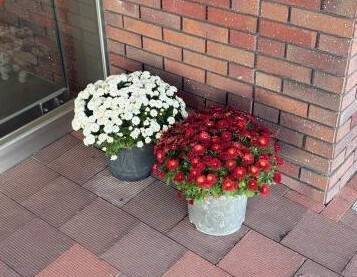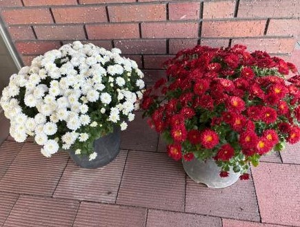 東加古川公民館草花ボランティア「クリスマスローズの会」の代表さんから見事な紅白の小菊の鉢植えをいただきました。早速、玄関に飾っています。