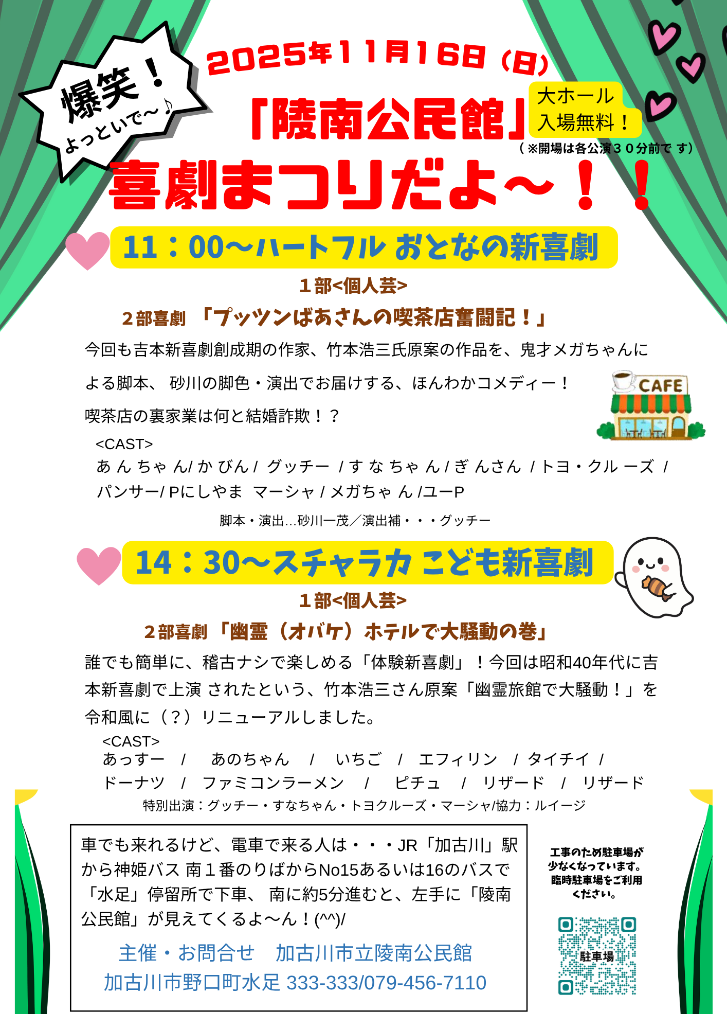 11月16日・陵南公民館で新喜劇開幕! 更新日:2025年11月11日 お待たせいたしました! 今年も陵南公民館にて創作新喜劇の舞台発表をします! みんな見にきてや~♪ この記事に関するお問い合わせ先 担当課:陵南公民館郵便番号:675-0019住所:加古川市野口町水足333-333電話番号:079-456-7110ファックス番号:079-427-6755問合せメールはこちら みなさまのご意見をお聞かせください このページの内容は分かりやすかったですか。 分かりやすかったふつう分かりにくかった このページは見つけやすかったですか。 見つけやすかったふつう見つけにくかった