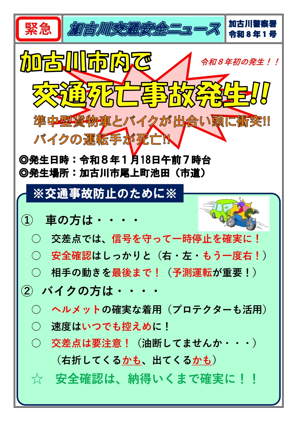 ・令和8年1月18日(日曜日)午前7時台、南進していた準中型貨物車と東進していたバイクが信号のない交差点で出合い頭に衝突し、バイクの運転手の方が亡くなりました。