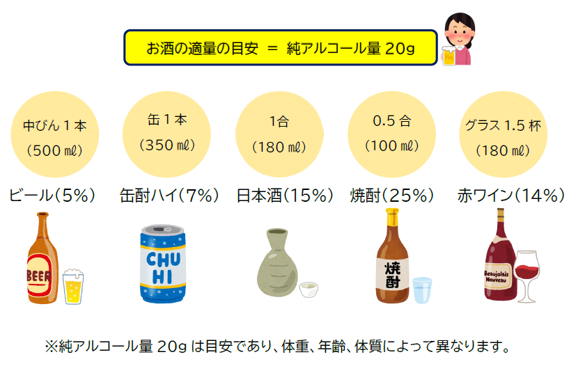 生活習慣病(高血圧、糖尿病など)予防のために、1日の飲酒量として純アルコール量が20gを超えないようにしましょう。