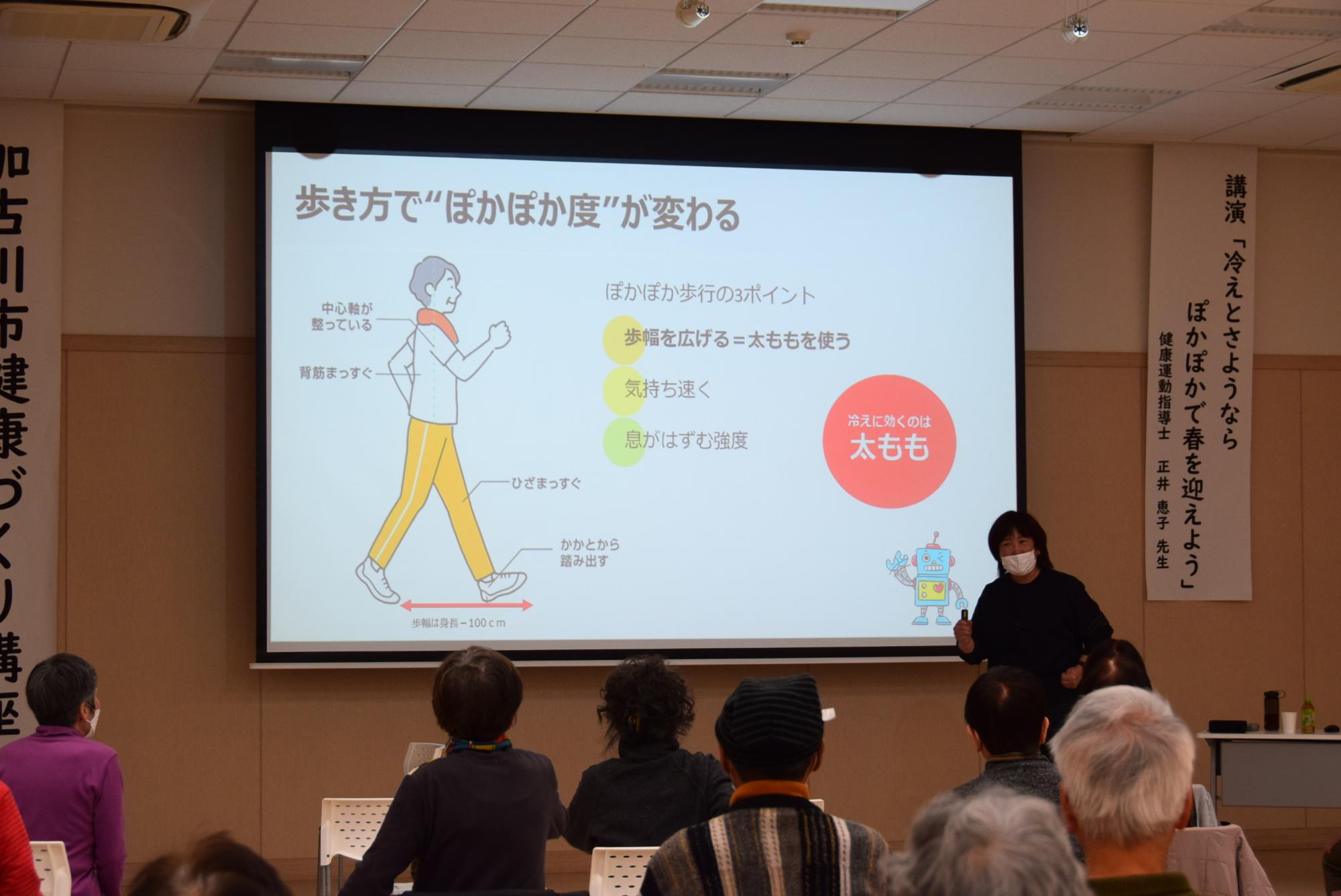 市の管理栄養士より体を温める食事や減塩について、保健師よりヒートショックや感染症の予防についてお話し、終盤には運動の実技も交えました。