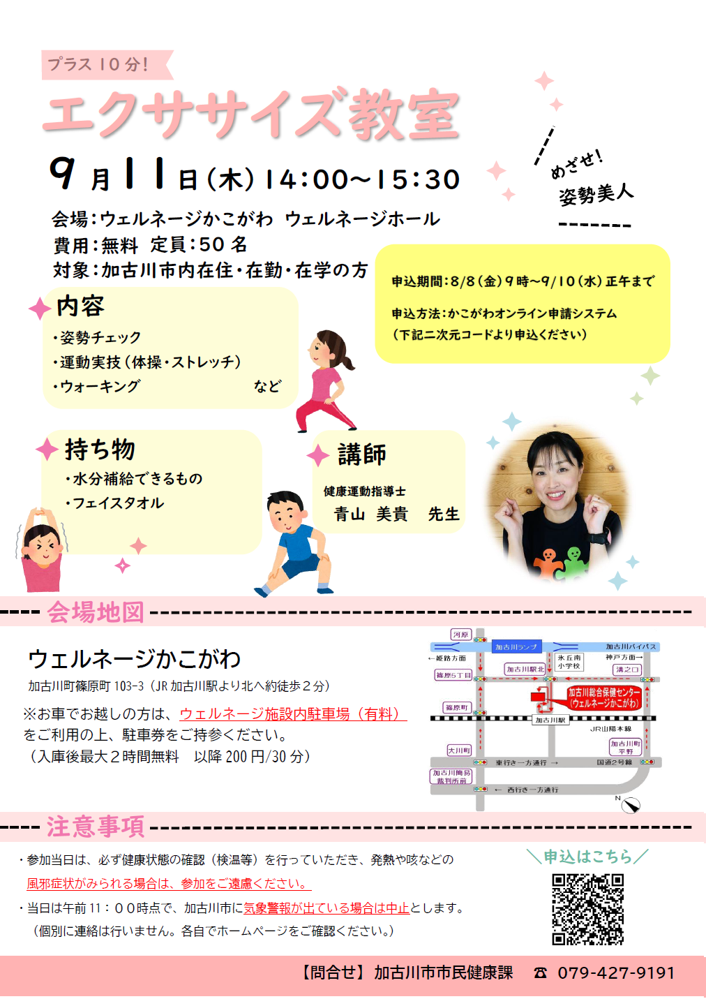令和7年9月11日(木曜日)ウェルネージかこがわにて、健康運動指導士の青山 美貴 先生を講師にお招きし、「プラス10分!エクササイズ教室」を開催しました。