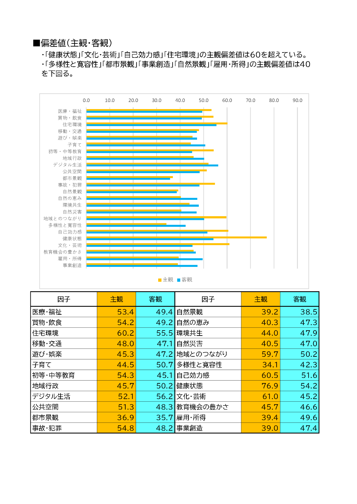 国が令和7年度に計測した全国の地域幸福度(Well-Being)指標と比較し、加古川市の主観指標と客観指標のそれぞれを24の因子ごとに偏差値として表示しました。