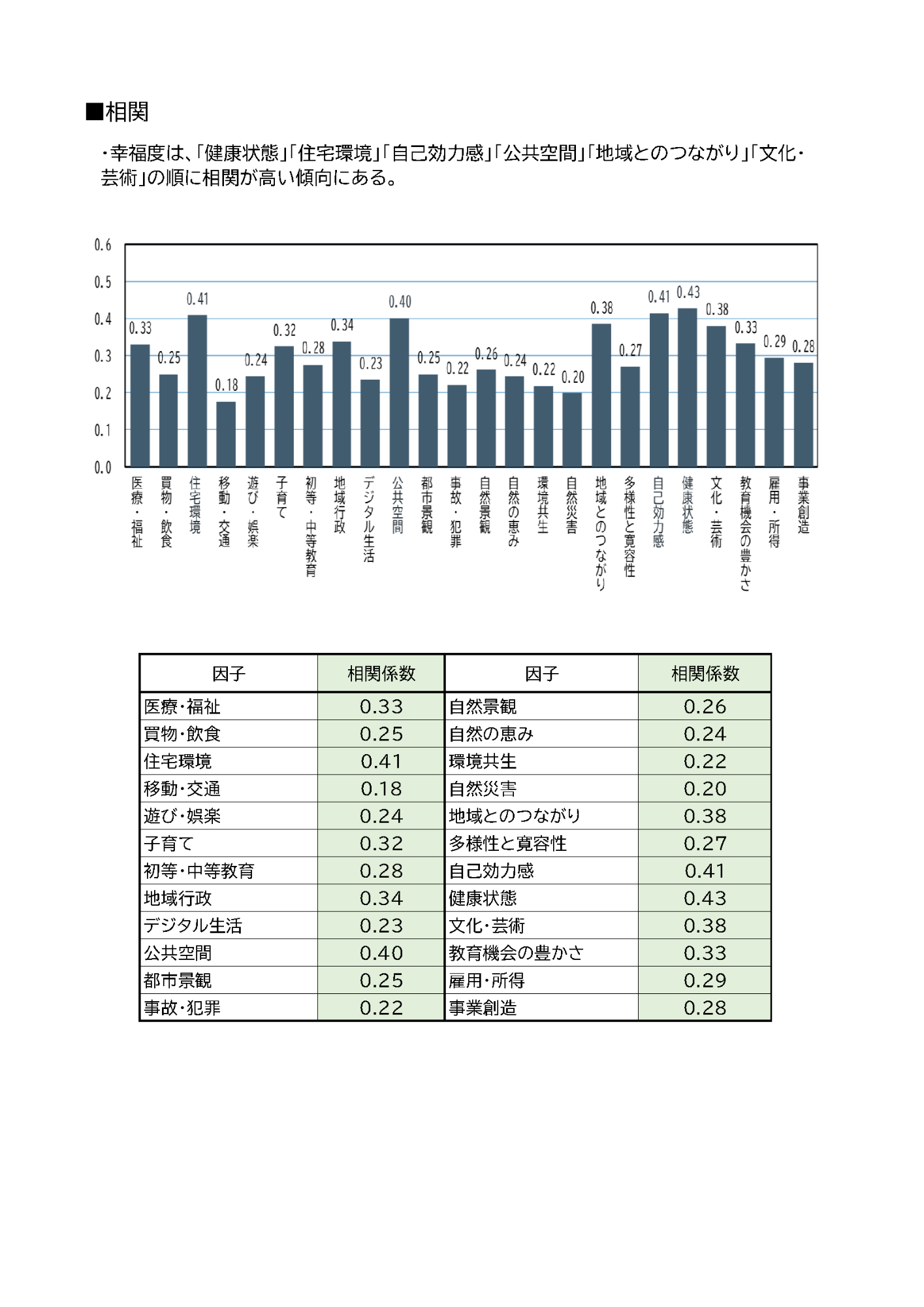 幸福度(点数)と、地域幸福度(Well-Being)指標を構成する24の因子との関係性の深さを表します。