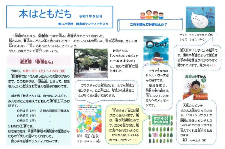 9月は、読み聞かせ会「教信さん」のお知らせと、新しく図書室に入った本の紹介を載せてくださっています。