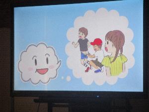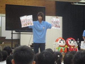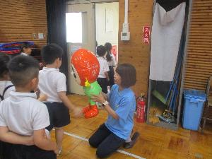 お話していただいたお礼を言ってから、最後は、加古川市社会福祉協議会イメージキャラクター「ふくちゃん」「かこちゃん」とタッチ!
