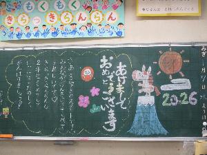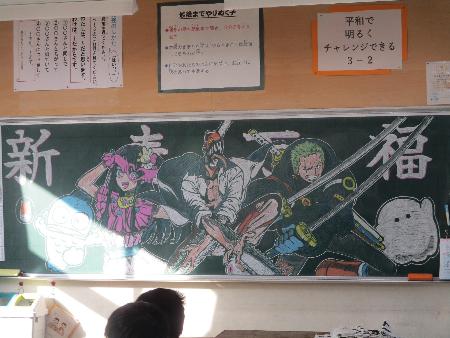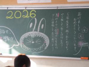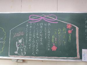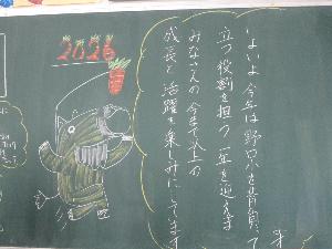 1月7日(水曜日)の始業式では各学級、「黒板アート」で、担任からの熱いメッセージが発信されていました。