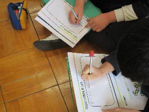なかよし学級の子どもたちは、教室の広さを有効に活用し、のびのびと書いていました。