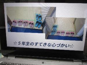 スリッパがなかなかそろわず、先生方が頭を抱えておられるのを知って、掃除担当である5年1組の皆さんが、このようにテープで枠取りを作ってくれました。
