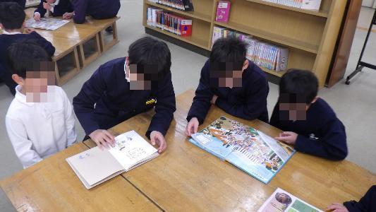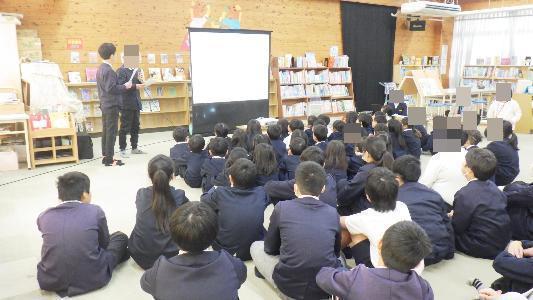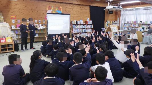 先日、1年生・幼稚園の子たちと交流読書をしました。図書ボランティアの方をお招きし、読み聞かせをしてもらいました。楽しい絵本を読んでいただいた後は、物語の内容に関するクイズに挑戦しました。1年生や幼稚園の子も、6年生も、多くの子どもたちが手を挙げて積極的に答え、大いに盛り上がりました。