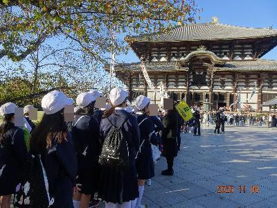 1日目の法隆寺では、世界最古の木造建築に感動し、奈良公園では班の友達と協力しながらウォークラリーに取り組み、限られた時間の中で多くの発見をしました。東大寺では、大仏の大きさに圧倒され、日本の歴史の深さを感じました。宿では、美味しい食事を囲みながら友達と語り合い、笑顔あふれる温かな夜を過ごしました。