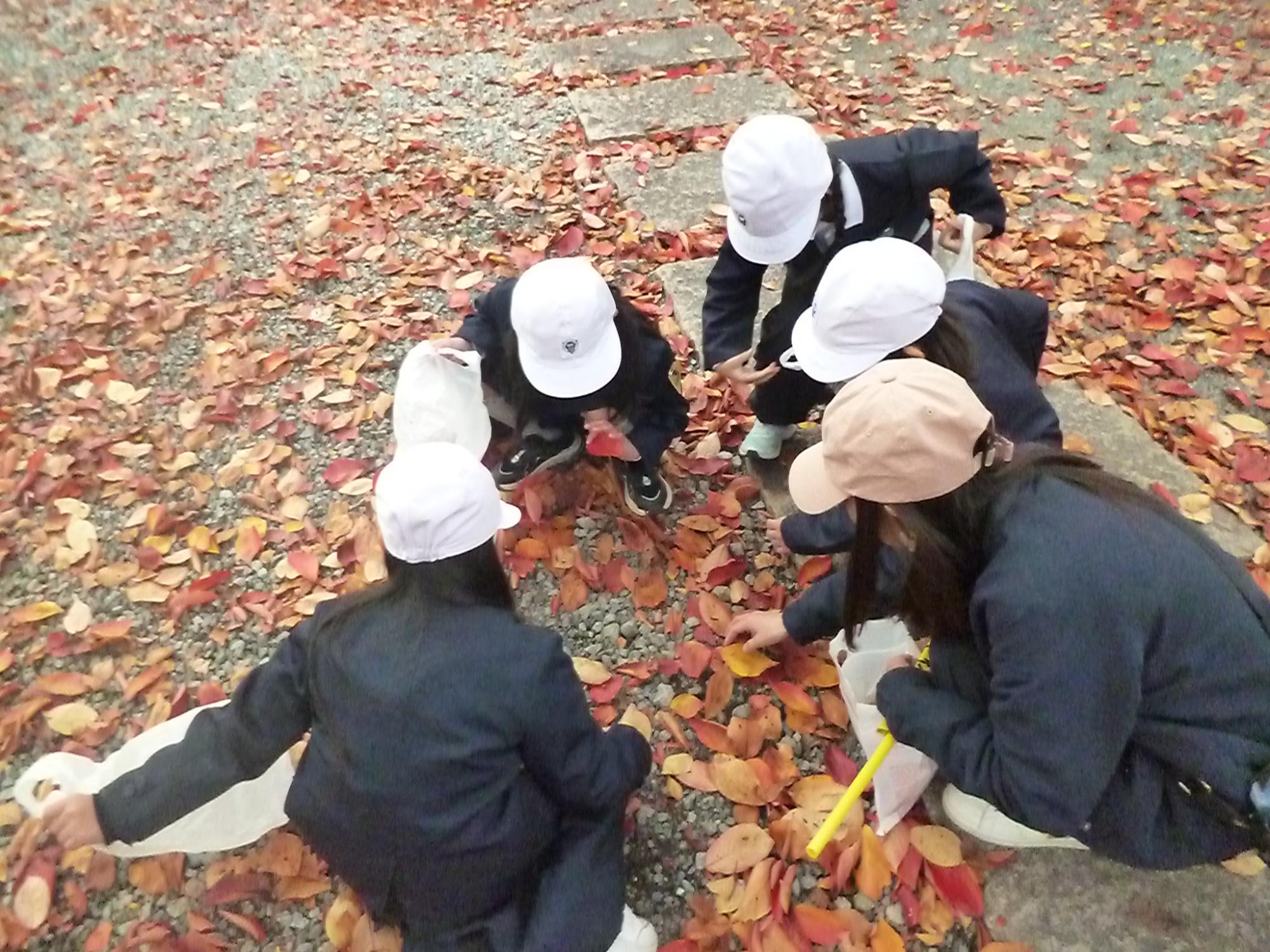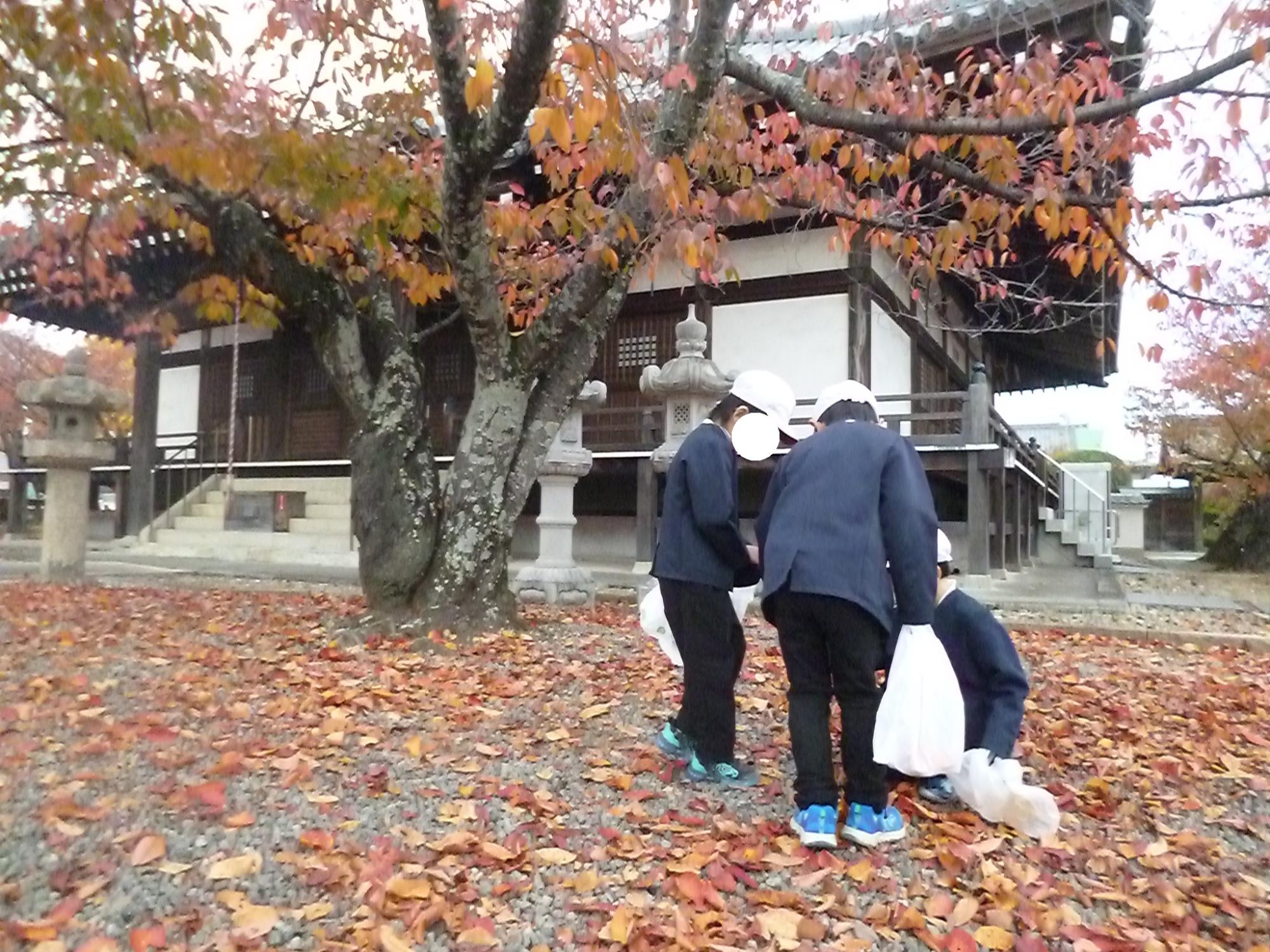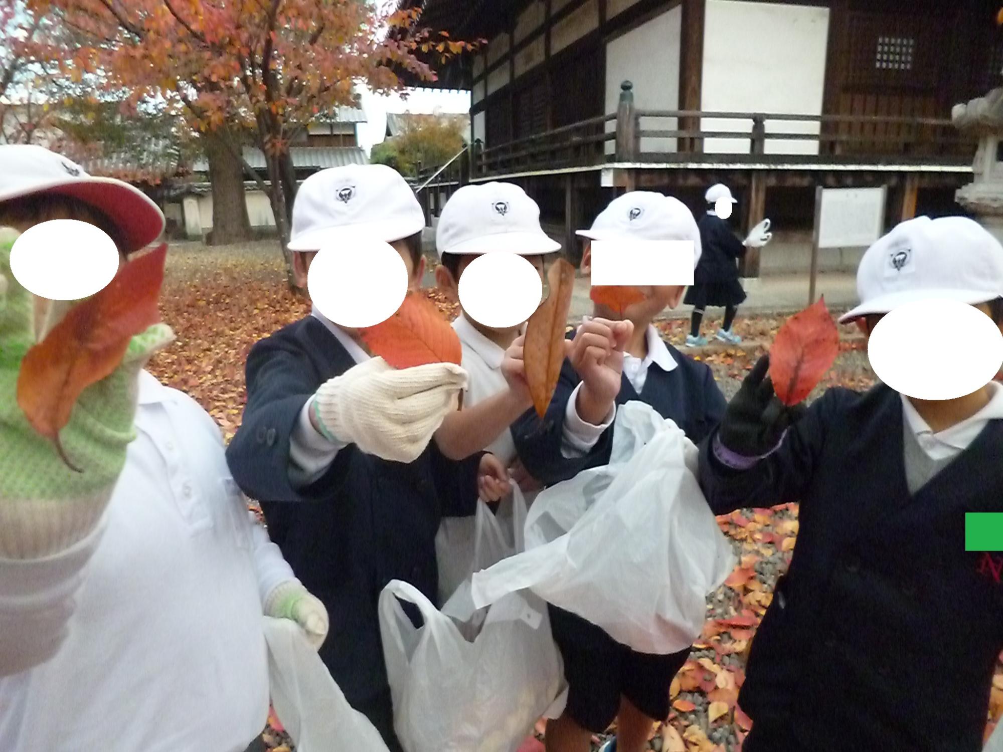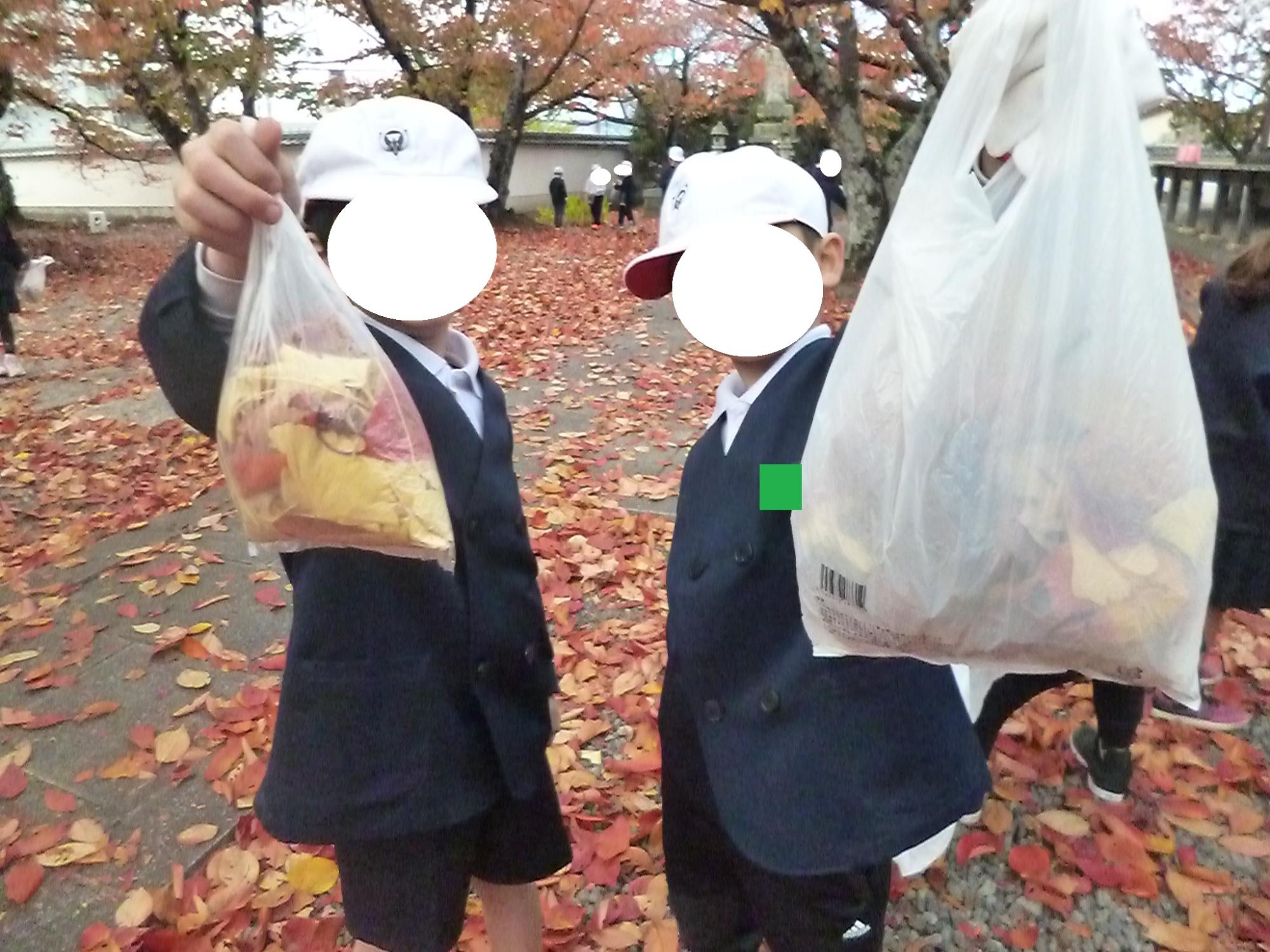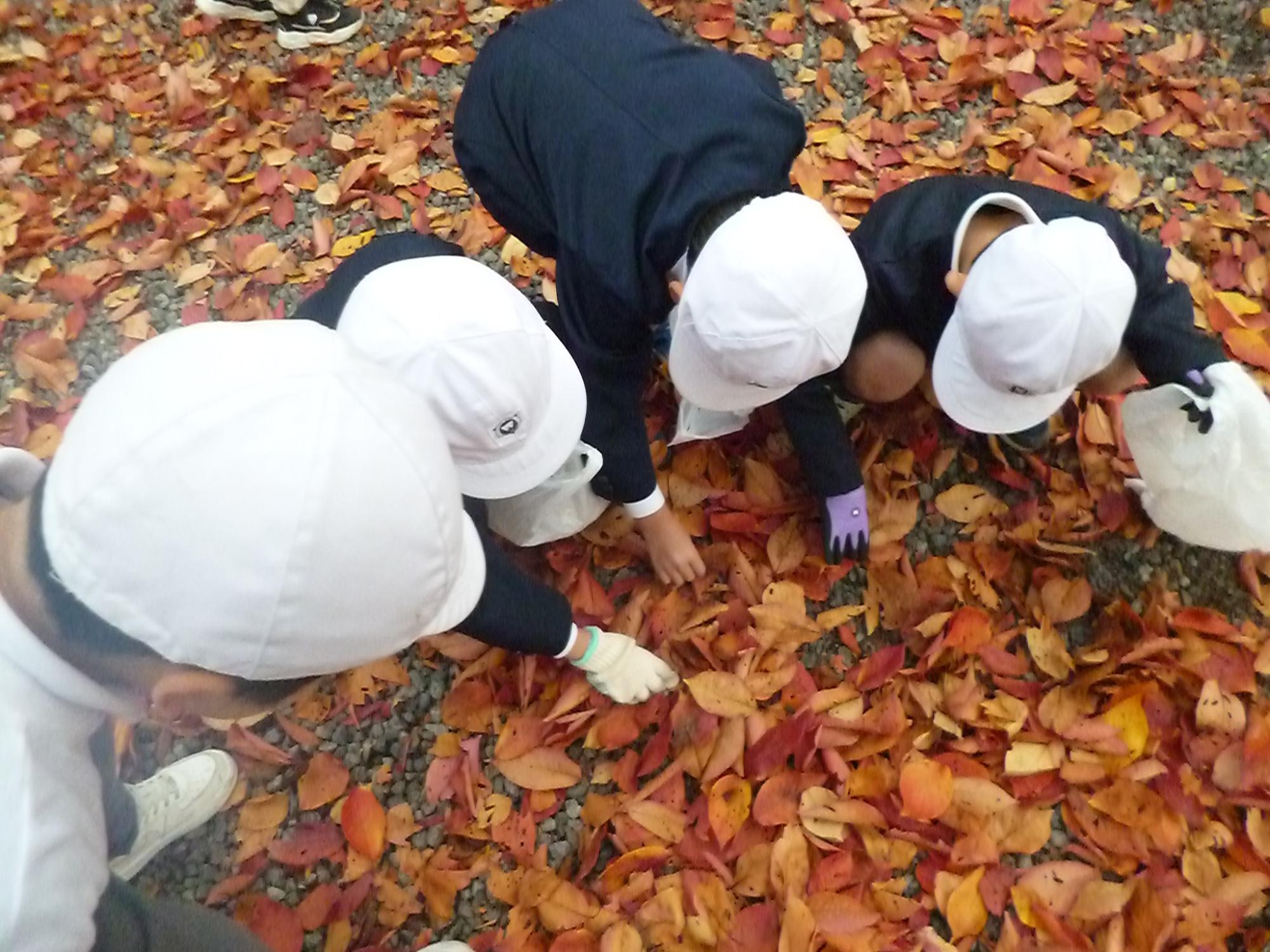 11月19日に、教信寺に落ち葉拾いに行きました。子どもたちは、自分のお気に入りの落ち葉を見つけて拾いました。友だちと、「こんなに大きな落ち葉があったよ」「この落ち葉、真っ赤ですごくきれい」「この落ち葉は半分が赤で、半分が黄色だ」などと話しながら、秋に親しみました。