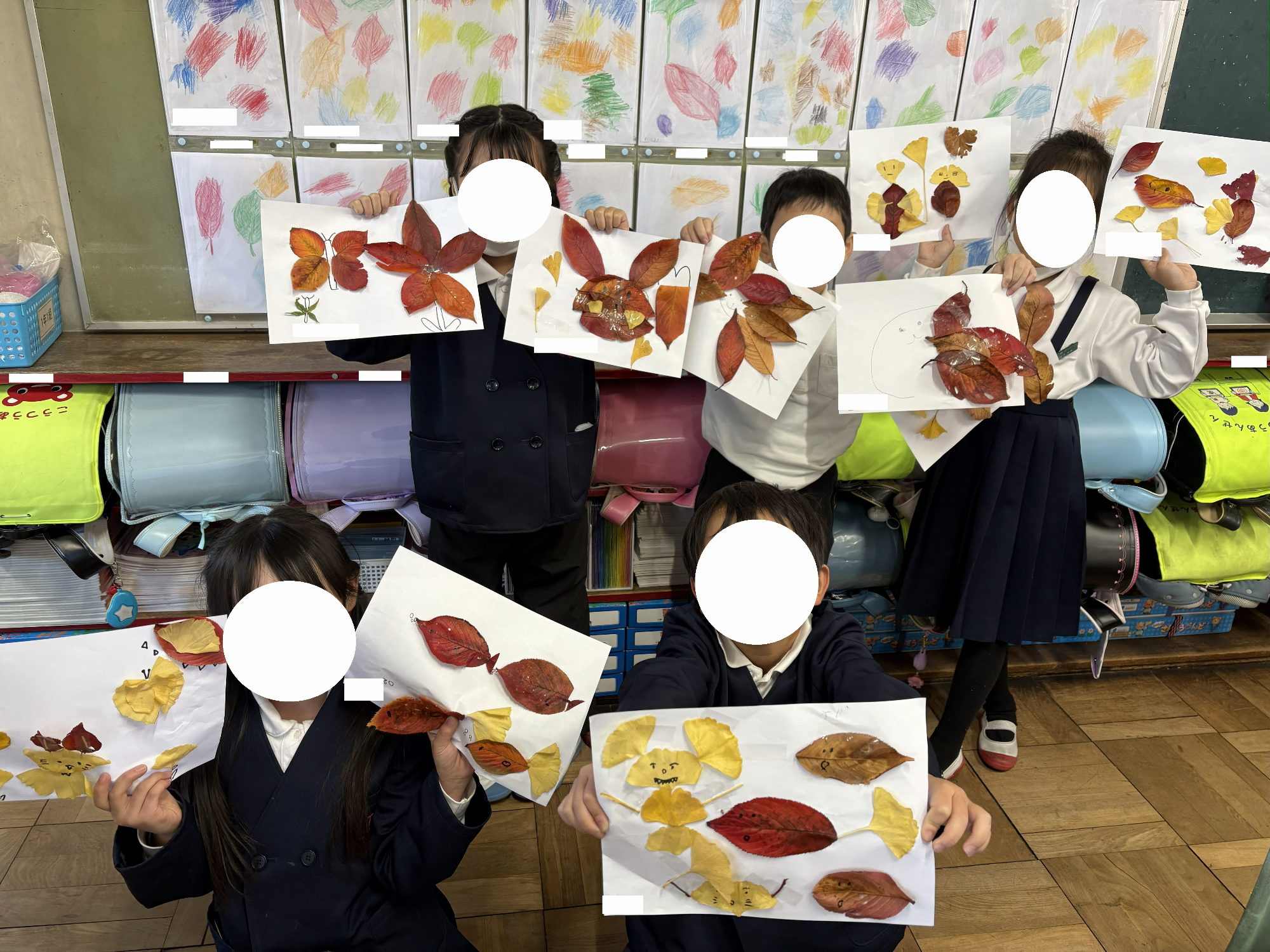 教室に帰ってからは、拾ってきた落ち葉を貼って作品を作りました。また、落ち葉の擦り出しをし、葉脈の存在にも気づきました。
