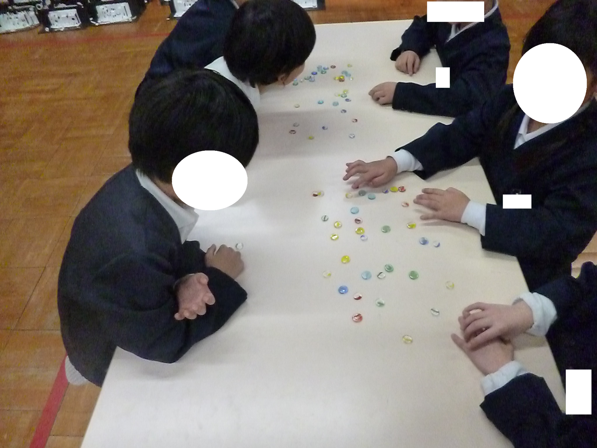 クラスごとに分かれて、あやとり、お手玉、けん玉、めんこ、おはじき、こま回しをしました。
