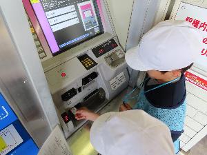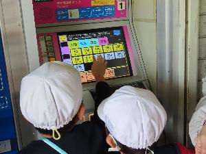 2人で協力して、切符を買います。「子ども2人」のボタンを見つけるのに苦労しましたが、無事買うことができました。