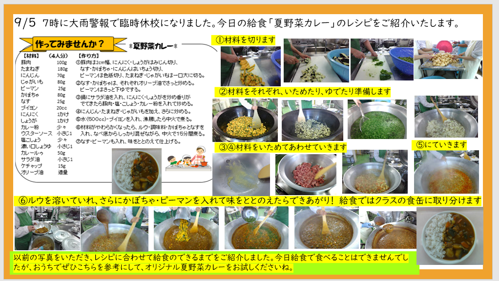 9月5日 本日警報で臨時休校 夏野菜カレーレシピのご紹介
