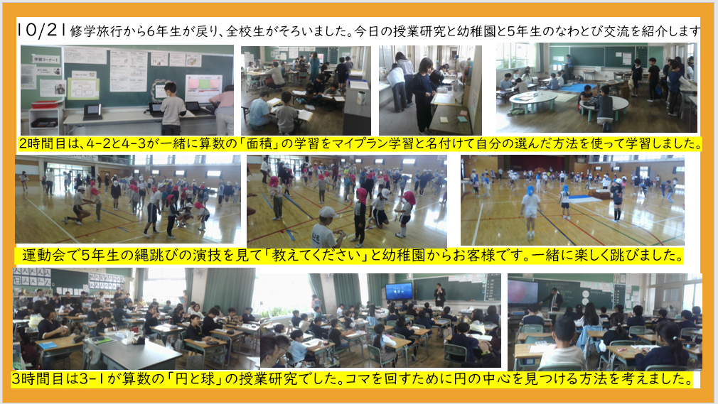 10月21日 5年生幼稚園と縄跳び交流 3・4年生研究授業