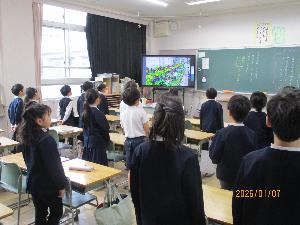 感染症対策として、再びリモートでの始業式となりましたが、校舎や花壇の花々の映像とともに、元気に校歌を歌う様子が見られました。