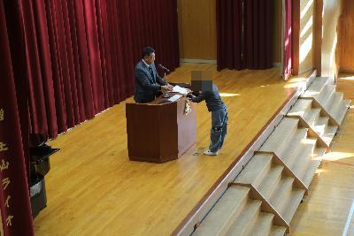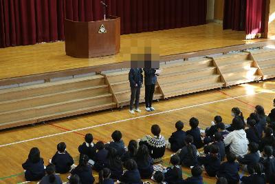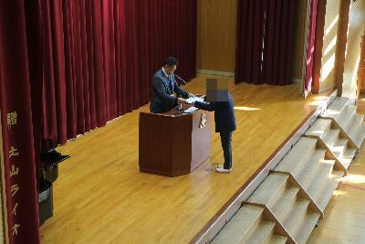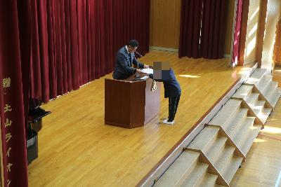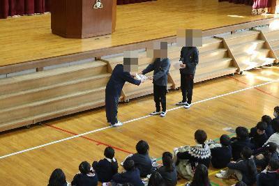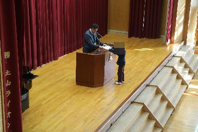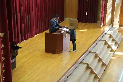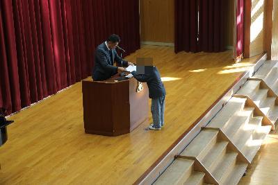 まず始めに、自由研究や、図工、習字で、優秀な成績を収めた児童に表彰がありました。名前を呼ばれた児童は、大きな声で返事をすることが出来ました。
