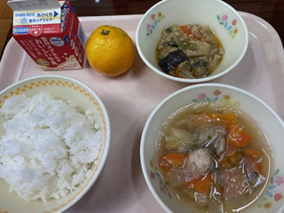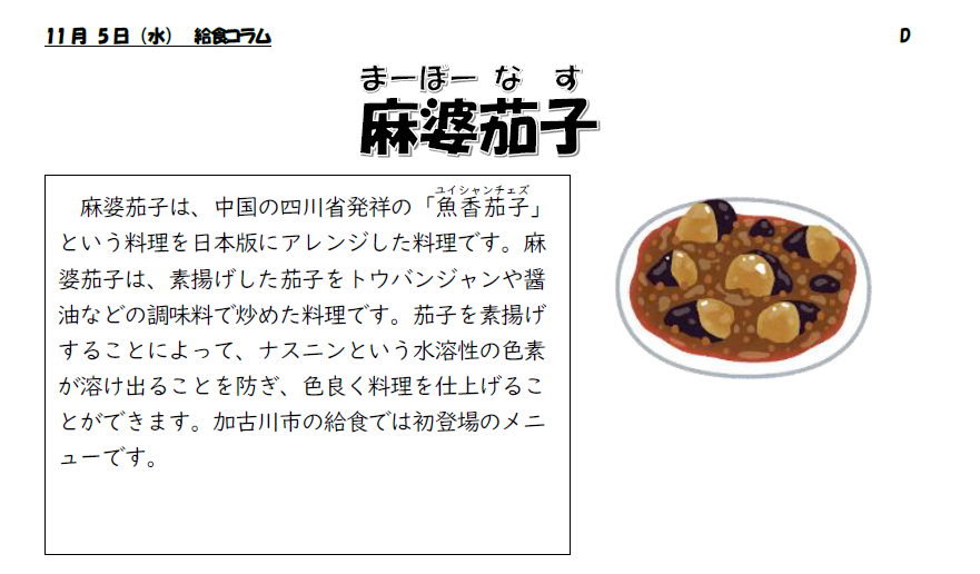 今日の給食には新メニューの「麻婆茄子」が登場しました。ナスやひき肉はもちろん、タケノコやタマネギなどの野菜が入っていて、いろんな味や食感が楽しめました。