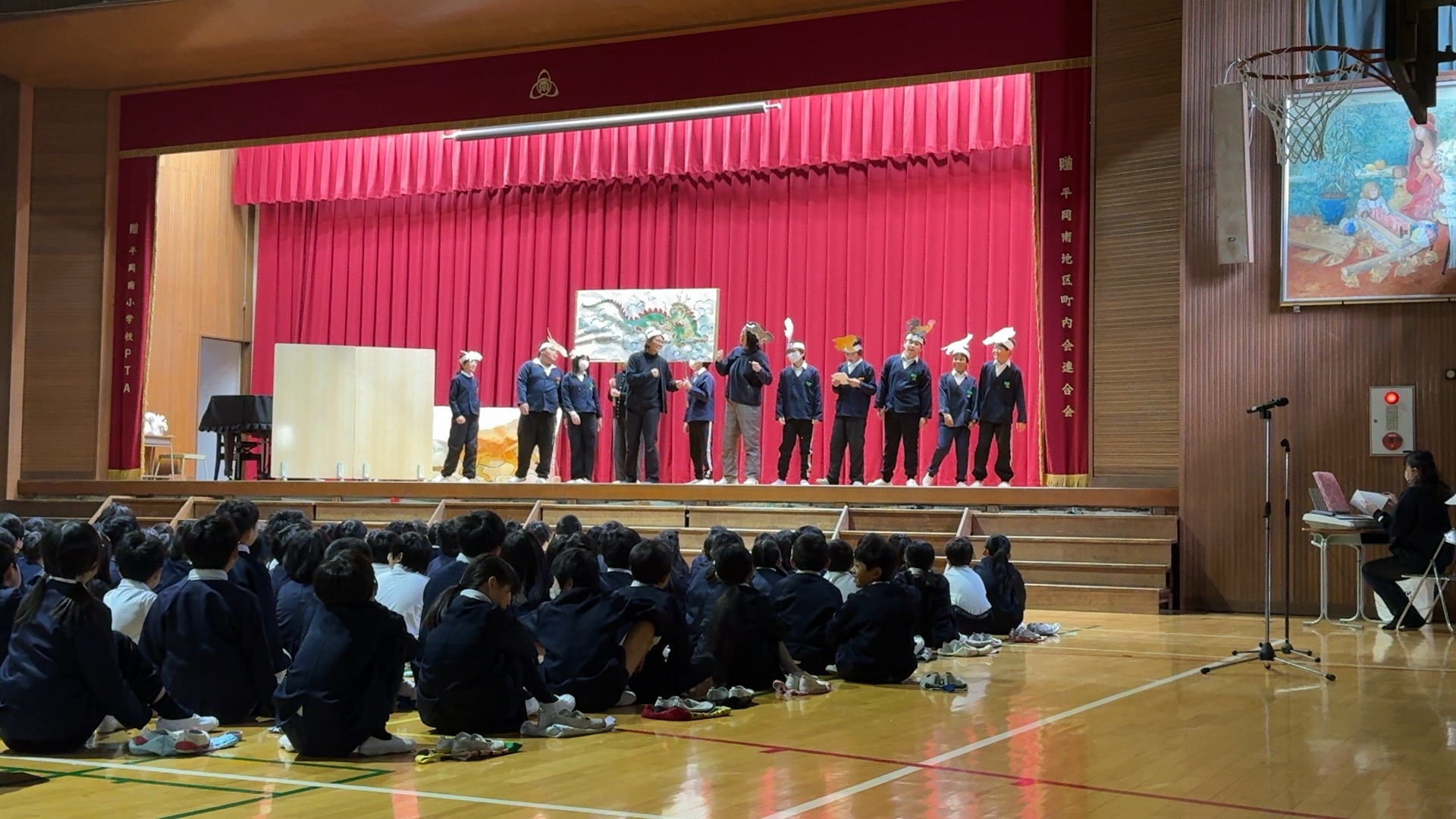 今月の児童集会では、図書委員会と図書ボランティアさんによる音読劇「十二支のはじまり」を鑑賞しました。役割分担をして動物を演じたり、物語を読んだりして南っ子のみんなを楽しませてくれました。