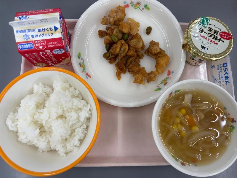 献立は、ごはん、牛乳、ホキの更紗揚げ、