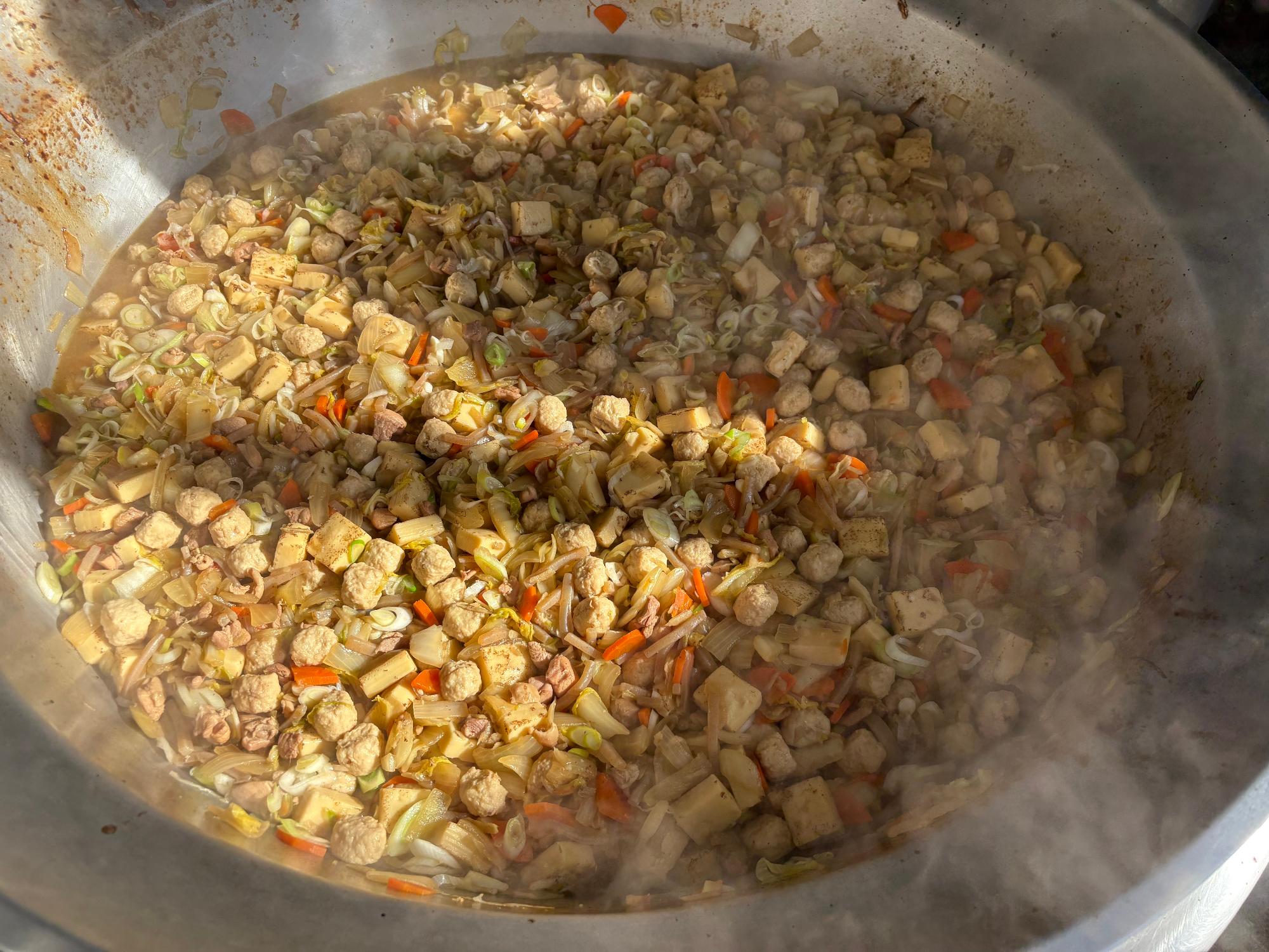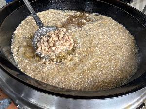 ほぐし終わったら、釜に削り節、ちりめんじゃこ、調味料を入れ、調理をしていきます。