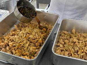 油揚げを入れたあと、仕上げに糸切り昆布を投入!昆布が全体に混ざるように、ほぐしながら3人がかりで仕上げます。