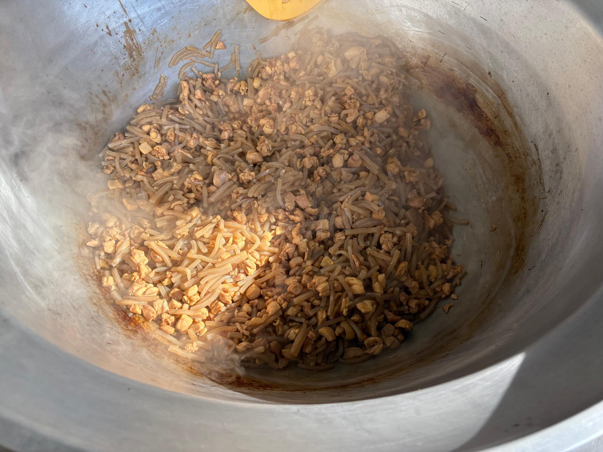 鶏肉、たまねぎ、にんじん、コーンとケチャップやウスターソースなどの調味料でじっくり煮込んで作ります。