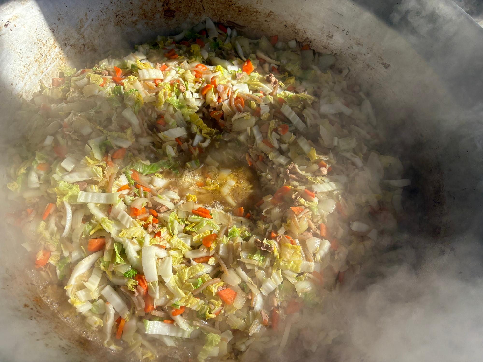にんじん・たまねぎ・はくさいと残りの調味料を入れて炒めます。