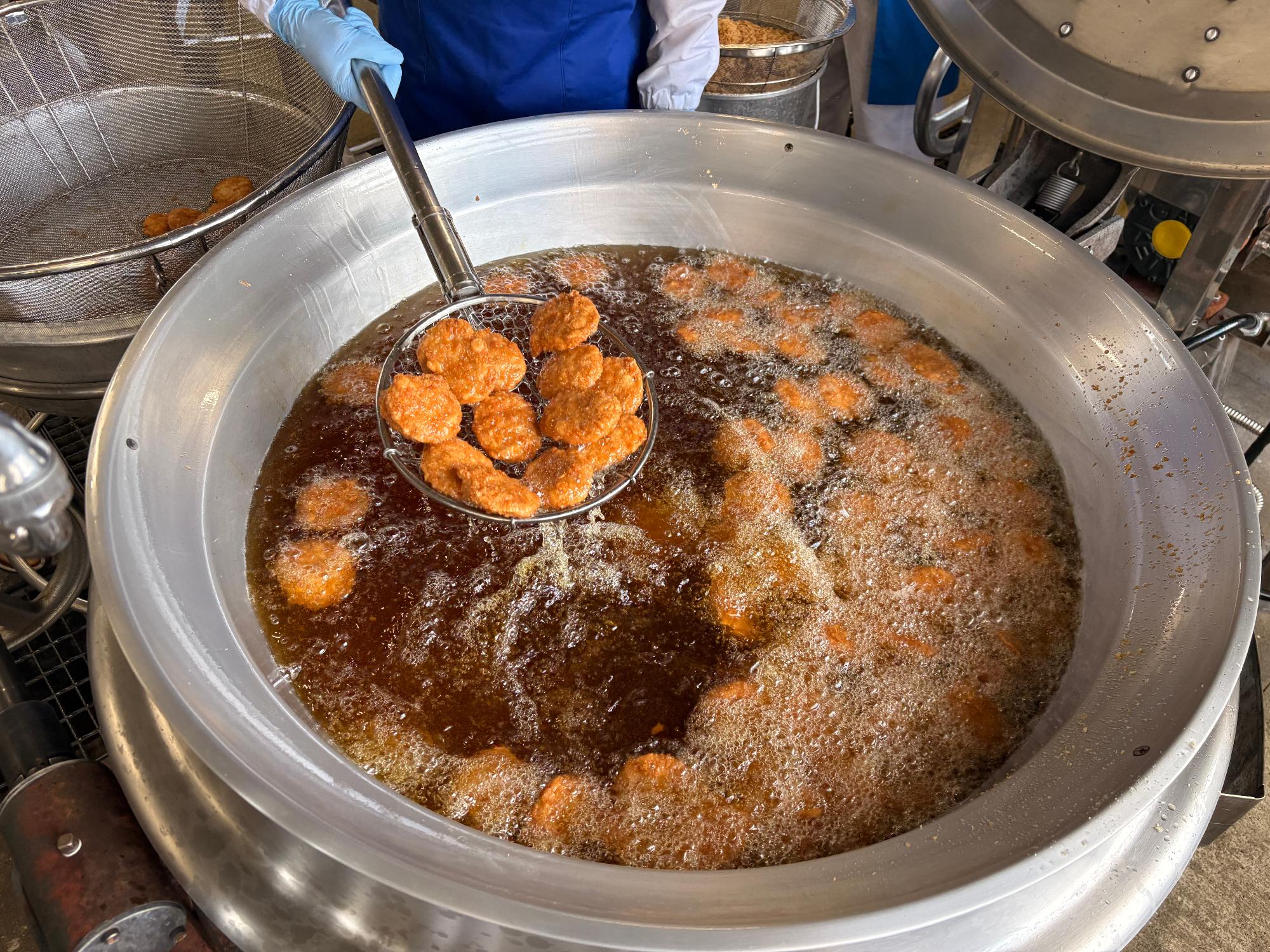 給食室で、ミニとんかつとえびフライを揚げています。(写真はミニとんかつを揚げている様子です)
