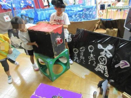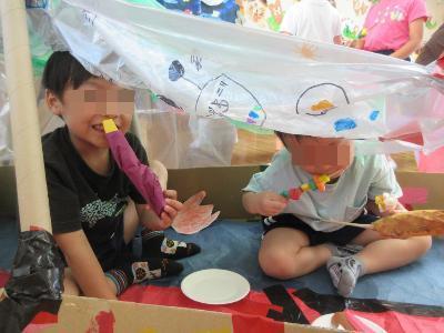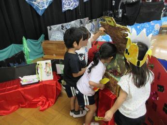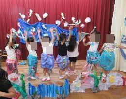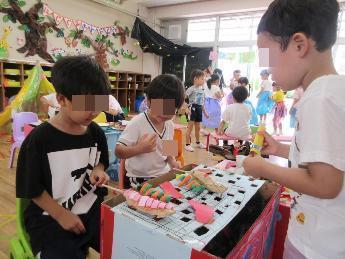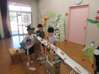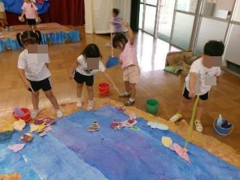 5歳児は、1学期から協力して作っている迷路がどんどん進化し、”うみのしま”から”かいぞくじま””ジャングル”を通って、”たからじま”へ向かう、ぼうけん迷路が出来上がりました。途中、あちこちに海賊が潜み、宝を奪われないように冒険の邪魔をするという罠も考えて遊んでいます。また、”人魚のいりえ”には、かわいくておしゃれな人魚たちが海賊、島のこども達が歌ったり踊ったりするステージもあります。