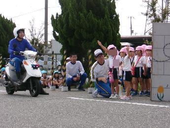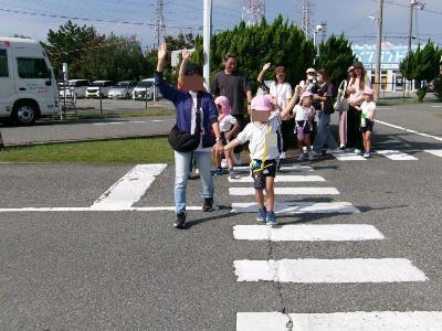 5歳児が東播自動車教習所で親子交通安全教室に参加しました。信号の見方や交通ルールについて、DVDを見たり保護者の方と実際に横断歩道を歩いてみたりしながら学びました。また、実演を通して、車やバイクが急には停まれないことや道路から飛び出すと危険であることも、実感した様子でした。最後にいただいたキラキラのメダルに書いてある交通安全の約束を友達と何度も繰り返し読んで確認しているこどももいました。また降園時には早速、園の前の横断歩道で、保護者の方と一緒に指差ししながら左右を確認し、しっかり手を挙げて道路を渡る様子が見られ嬉しかったです。