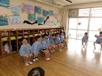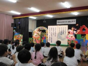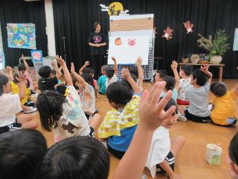 9月3日に加古川幼稚園と合同で食育コンサートを楽しみました。クッキーズ(歌のお姉さん)の歌や踊り、クイズ等を通して、こども達は食べ物の栄養や食事、規則正しい生活の大切さについて学びました。たくさんあった歌の中でも特に「大豆のうた」では、お姉さんたちの振りを見ながらリズミカルに体を動かし、大喜びで歌っていました。参加してくださった保護者の皆様、ありがとうございました。