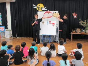歯科健康教育の一環で、歯科衛生士の方が来園してくださりブラッシング指導をしてくださいました。パネルシアターを通して、歯の大切さや虫歯予防のために必要なことを分かりやすくお話してくださいました。5歳児は、6歳臼歯や歯磨きの仕方について実際に歯を磨きながら教えていただき、歯科衛生士の方のお話を真剣に聞きながら正しい磨き方を真似しようと歯ブラシの向きや動かし方を意識する様子が見られました。口の健康が元気な体につながることをこども達なりに感じることが出来た時間でした。