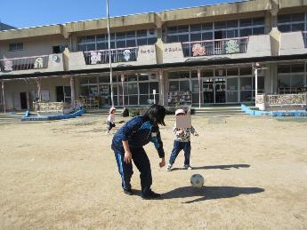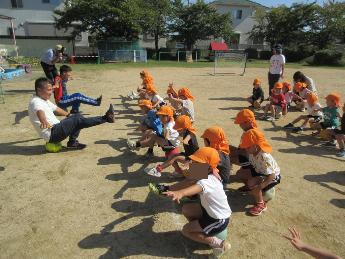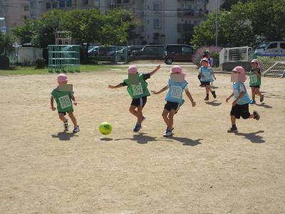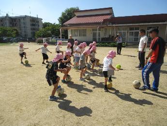 運動遊びのコーチが来園してくださり、こども達は、鬼ごっこやボールを使った遊びを通して、ルールのある集団遊びの楽しさを味わいました。バランスをとりながらボールの上に体を乗せて静止したり、ボールを高く上げ、ボールが落ちるまでに何回手を叩けるか挑戦したり、ドリブルやシュート等にもチャレンジしました。中にはサッカーボールをうまく足で操れず、もどかしい思いをしながらも最後まで諦めずにゴールまで運ぼうとしたりする姿も見られ、初めてのことや少し難しいことにも”やってみたい”という挑戦意欲を感じました。2チームに分かれてのサッカーでは、ビブスを着てサッカー選手になった気分でウキウキしていたこども達。友達と力を合わせ、何とかゴールにボールを入れようと一生懸命でした。次のサッカー教室も楽しみですね。