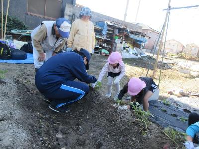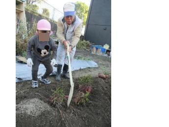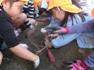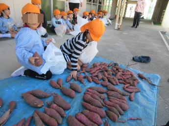 4歳児は幼稚園で、5歳児は学校運営協議委員の方の畑で芋掘りを体験しました。どんどん出てくるお芋に大興奮し、「私のお芋は6人家族だ!」「大きいお芋だから、なかなか掘れないよ!」「まだまだ出てくる~」と、友達と夢中で掘っていました。堀ったサツマイモを並べて数を数えたり、大きさや形で分けてみたり、はかりの針がどれだけ動くか予想しながら重さをはかって遊んだりしました。また、長いツルに驚きながら引っ張り合いっこをしたり縄跳びやしっぽとり、おしゃれごっこに使ったりしていました。秋を全身で感じながら、収穫の喜びを味わうことが出来ました。
