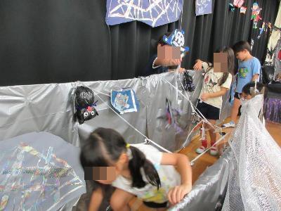 9月26日に造形展(参観日)を行いました。こども達は、保護者の方に”自分たちの作った島を見てほしい””一緒に冒険ごっこをしたい!”と、この日を楽しみにしながら遊びの準備を進めていました。友達と一緒に考えながら作ってきた島を案内したり、スイーツ島でおいしいスイーツを食べたり、魚釣りや冒険迷路を楽しんだり…。保護者の方々も冒険者の仲間入りをして、こども達と笑顔いっぱいで遊んでくださいました。ステージでは、人魚や海賊になって歌ったり踊ったりし、お家の方からも沢山の拍手をもらって、嬉しそうなこども達でした。
