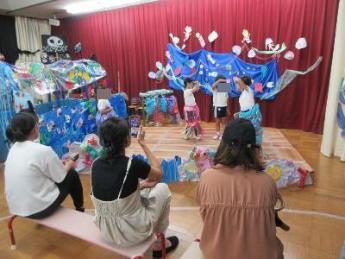 様々な曲に合わせて歌ったり考えたダンスを踊ったり楽器を鳴らしたり、”しんきょくコーナー”では自作曲を披露したり…4,5歳児ともにステージショーごっこはどんどん楽しいものに発展しています。