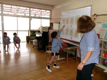 2回目の英語活動を行いました。今回のテーマは、数でした。こども達は、「1はOne、2はTwo!」と、知っていることを積極的に伝えながら興味をもって参加していました。1から10だけでなく、11、12の英語も教えてもらい、嬉しそうに何度も繰り返し言う姿は微笑ましかったです。英語活動の後も、しばらくこども達の興味は続き、数を数える時に英語で言ってみたり、友達とクイズを出し合ったりして楽しんでいました。こども達の姿から、新しいことを知る喜びを味わっていることが伝わってきました。