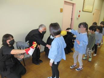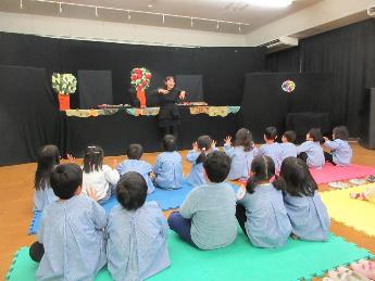 ふれあい保育の友達と一緒に人形劇を観劇しました。お話の展開にハラハラドキドキ!こども達は、思わず声をあげたり安堵の表情をしたりしてお話の世界に入り込んでいる姿が見られました。あんてぃさんの手作りの人形や背景がとてもあたたかく、大人もこどももとても楽しい時間を過ごさせていただきました。