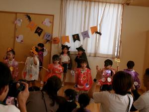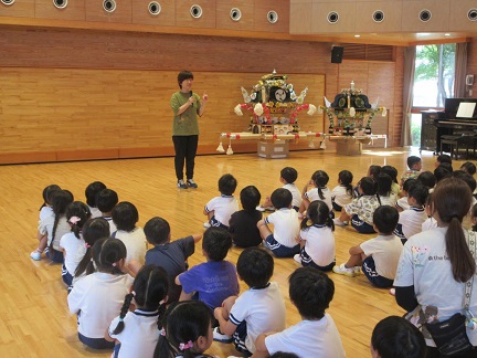 始業式は、全園児が遊戯室に集まって行いました。園長先生からは、1学期の終業式の約束事の確認や「夏休みはどう過ごしましたか?」という話がありました。また、「2学期はどのようなことをして遊びたいですか?」というお話に対して「玉入れ」「帽子取り」「大玉転がし」とやる気満々に答えたのは5歳児のにじ組。やる気に満ち溢れているのが表情や姿勢から伝わってきました。3,4歳児も「砂場」「かけっこ」など、したい遊びが出てきました。0~2歳児のこども達はお兄さんお姉さんの話をよく聞いていました。