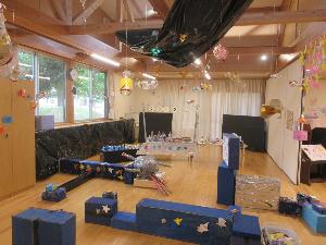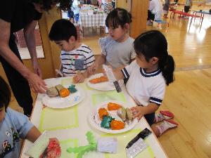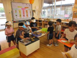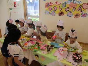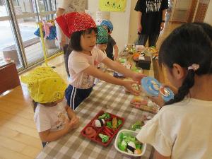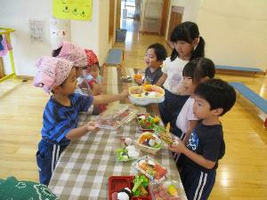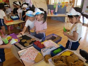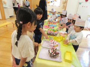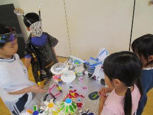 ごちそうをつくり、「みんなにも食べて欲しい」とお店屋さんになったり、宇宙を体験できる宇宙屋さんを作ったりして、各クラスで素敵な作品を作り上げました。各店舗ではクラスの友達だけでなく、異年齢でつくったなかよしグループや他のクラスの友達と一緒に遊んだり、遊び方を教えあったりして楽しみました。
