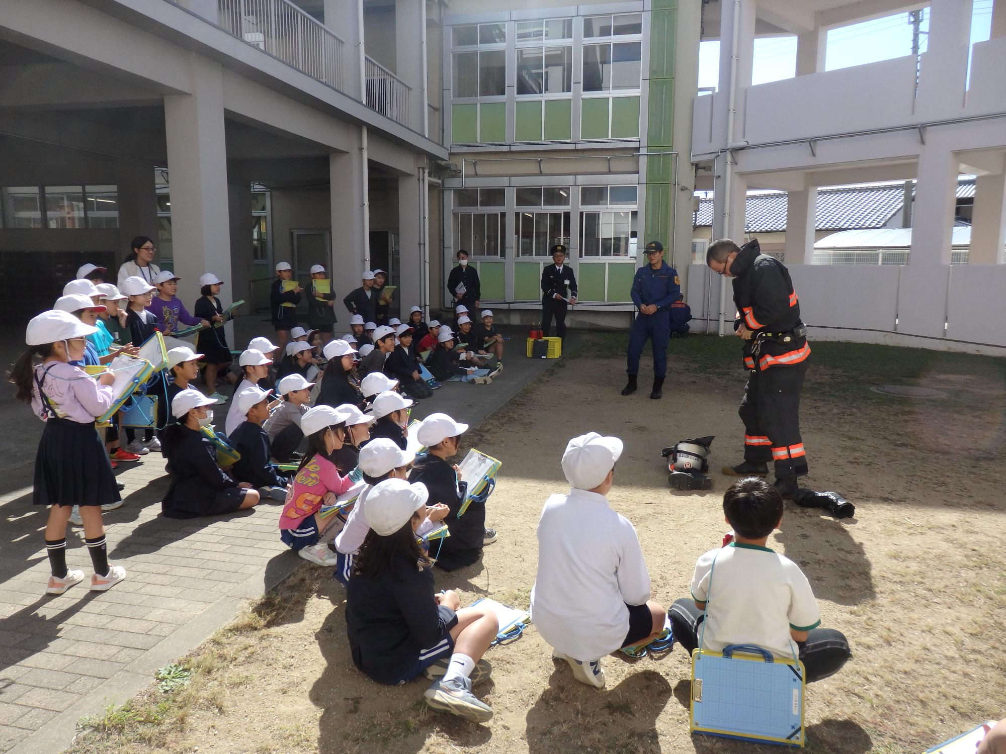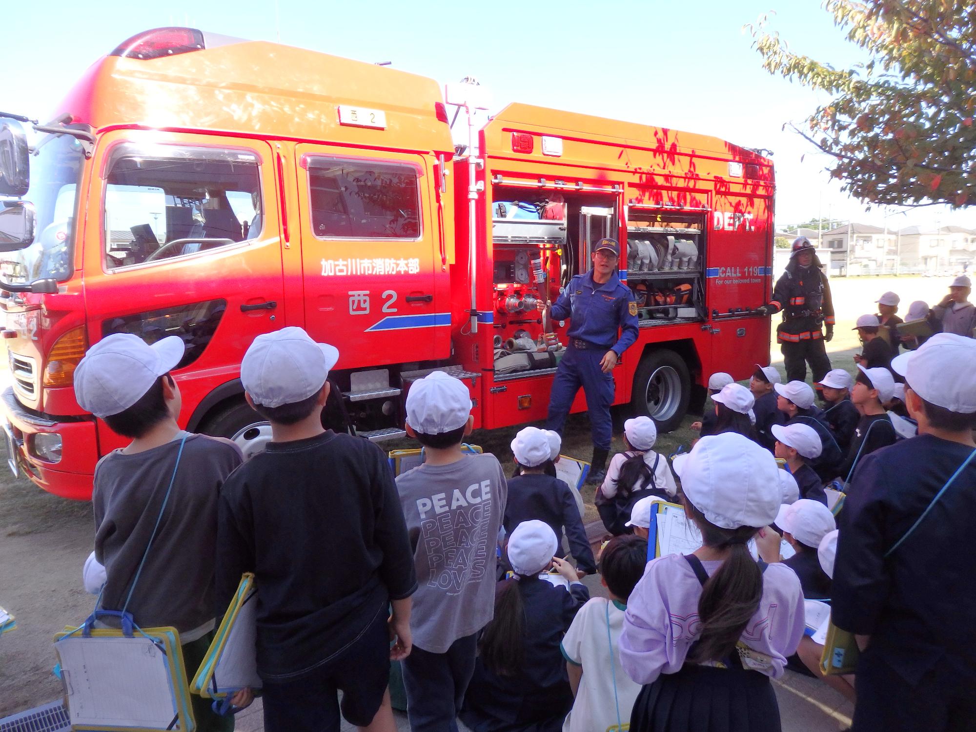 社会科の「火事からくらしを守る」という学習で消防士さんの働きについて学習しており、今回実際に加古川西分署から消防士さんに来ていただきました。
