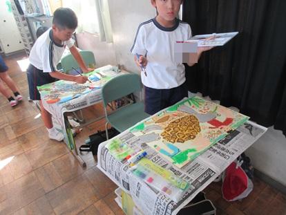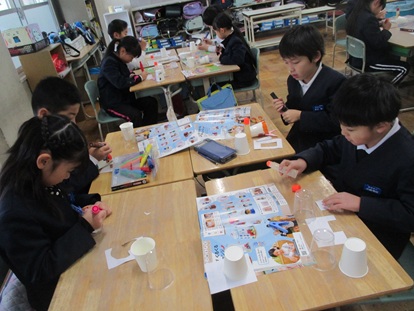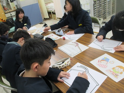 2年生は、学校探検の準備をしています。1年生に案内する教室のポスターを作っています。